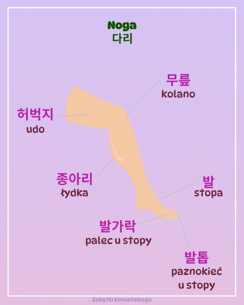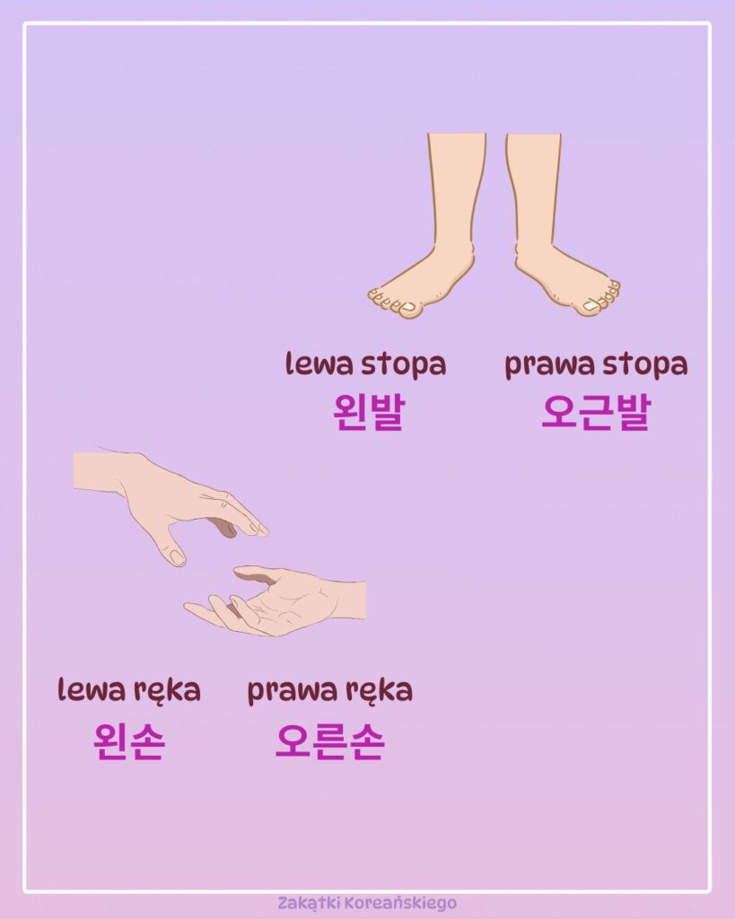 Teraz odróżnijmy lewą od prawej ręki oraz lewą od prawej stopy.W języku koreańskim lewa strona to 왼쪽, a prawa strona to 오른쪽. Przyda się, gdy chcesz powiedzieć, że coś cię boli po konkretnej stronie albo kiedy ktoś każe ci skręcić, prawda?