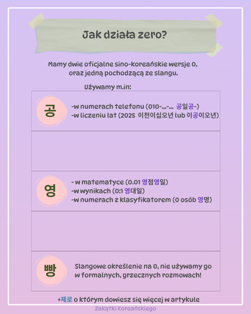 „0 제로” to koreańska forma liczby „zero”, która jest używana w codziennym języku, ale wyróżnia się tym, że w kontekście języka koreańskiego może mieć specyficzne znaczenie. Może odnosić się do „zera” w znaczeniu „braku” lub „niczego”, ale jest też stosowane w bardziej formalnym lub technicznym kontekście, w telekomunikacji czy nauce. np.”제로칼로리” (zero kalorii).