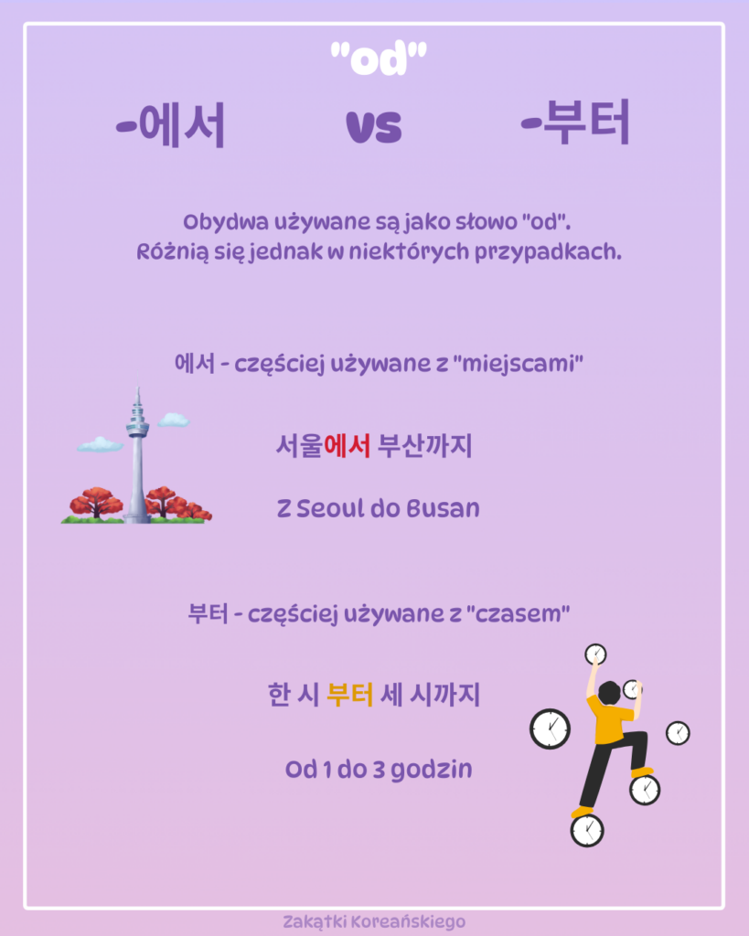 Często zdarza się, że osoby uczące się koreańskiego mają trudności z rozróżnieniem 에서 i 부터, ponieważ obie oznaczają „od”.