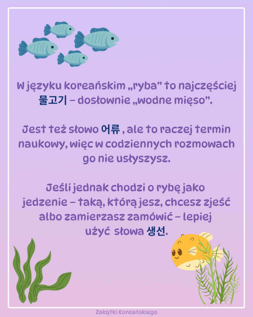 🐟 to 🐟? Nie do końca. W języku koreańskim jest ciekawa różnica między rybami. I tak, jeśli chcesz powiedzieć „ryba” jako zwierzę, użyjesz słowa 물고기 (dosłownie: 물 woda + 고기 mięso), ale jeśli masz na myśli rybę w kontekście jedzenia, to już będzie 생선. Ciekawe, prawda?