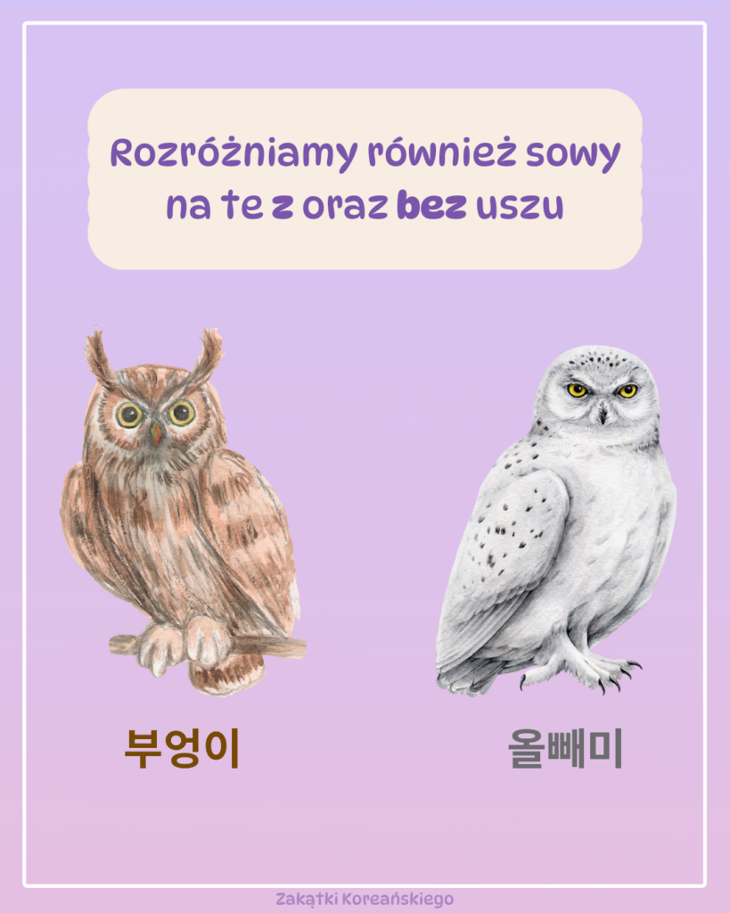 Okazuje się, że w Korei nie wystarczy powiedzieć po prostu „sowa”. Jeśli chcesz się wyrazić precyzyjnie, to musisz spojrzeć na… uszy! Tak, w koreańskim nazewnictwie sów kluczowe jest to, czy sowa ma widoczne „uszka”, czy ich nie ma. Jeśli ma, to mówimy o 부엉이, a jeśli ich nie ma, to 올빼미.🦉